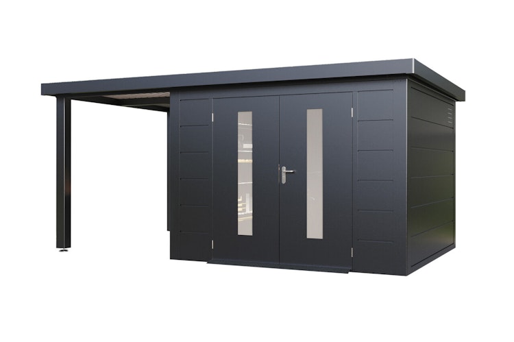 Wolff Finnhaus Premium Metall Gartenhaus Elvar 5424 Anthrazit inkl. 240 cm Anbaudach
