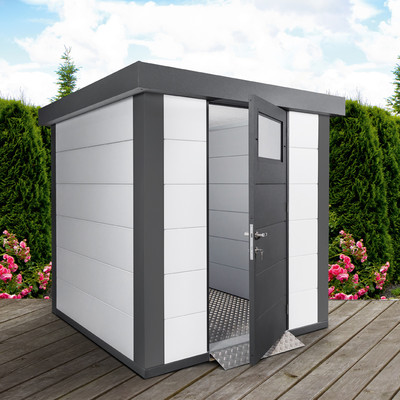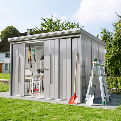 Optimale Stauraumlösungen bieten Ihnen die Wolff Finnhaus Comfortline Gerätehäuser. Die Metall-Gerätehäuser bieten ausreichend Platz z. B. für Gartenmöbel und -werkzeug.